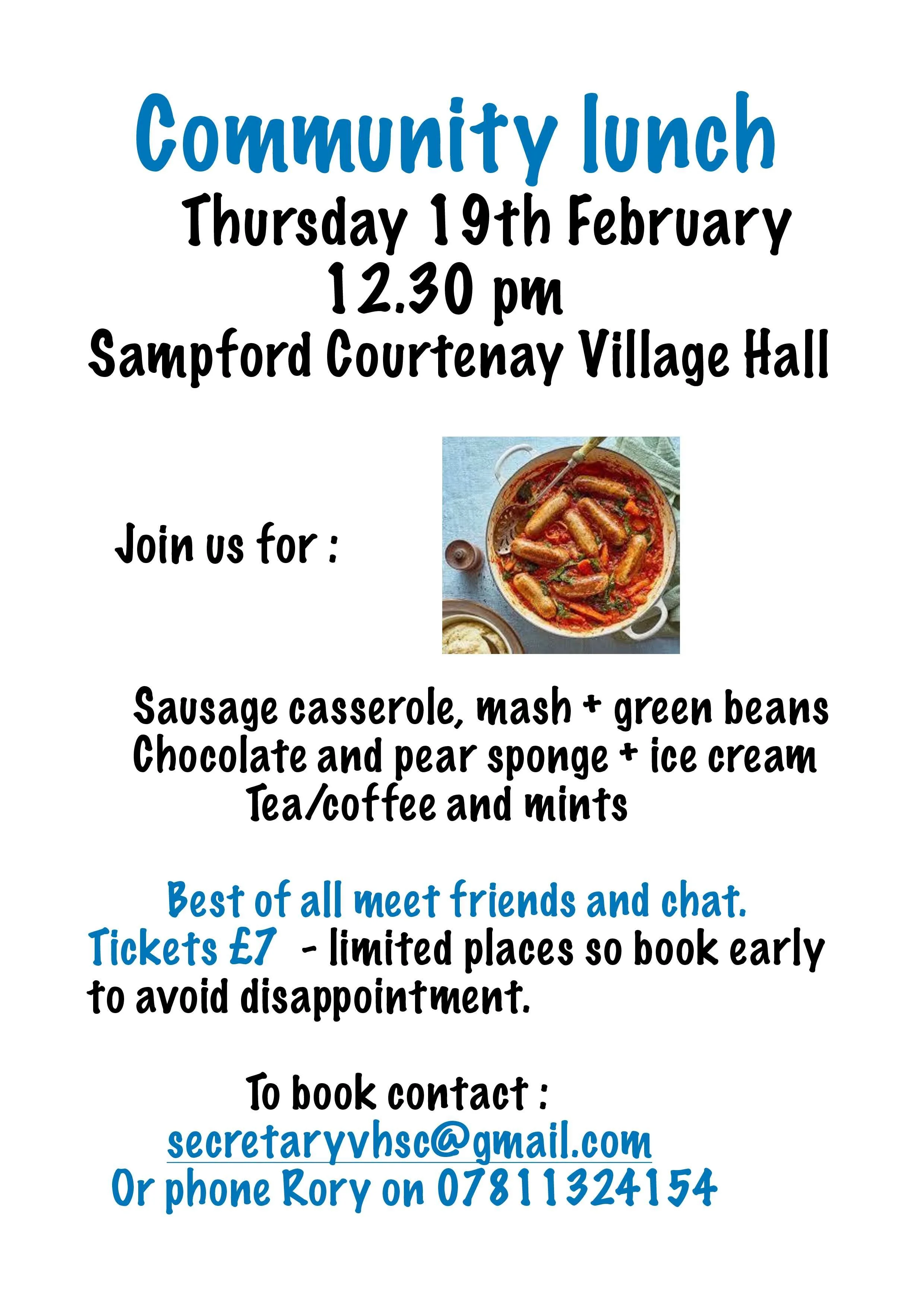 Thursday 19th @ 12.30 Community Lunch - Sausage Casserole and Mash, chocolate and pear sponge!