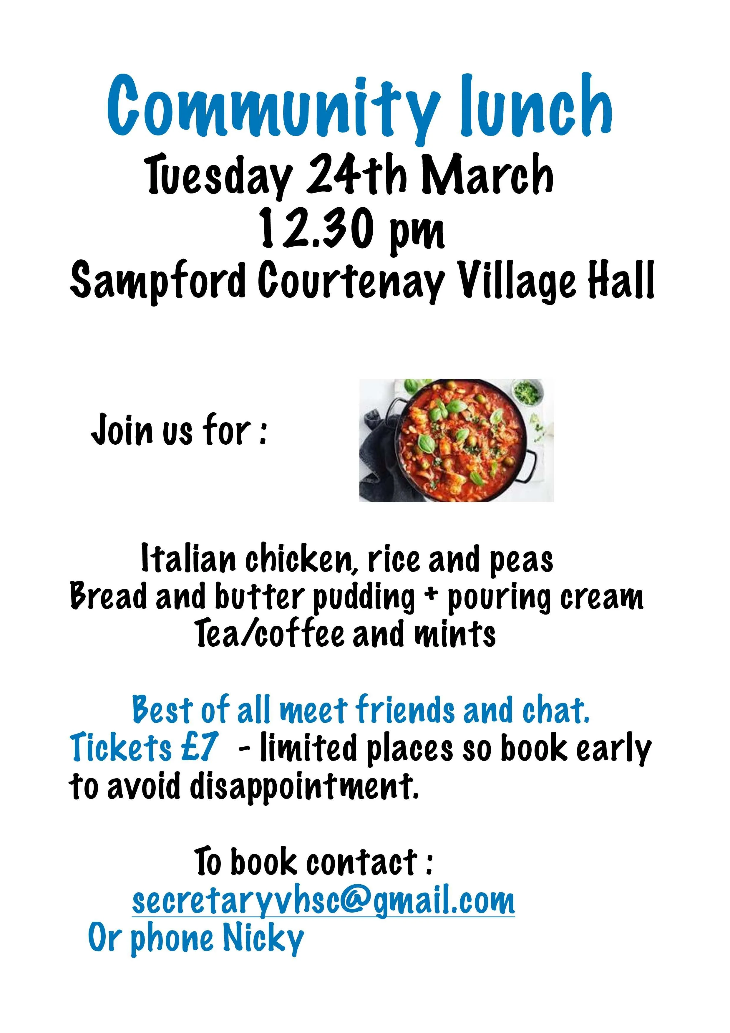 Tuesday 24th @ 12.30 Community Lunch - Casserole and greens, bread and butter pudding and pouring cream